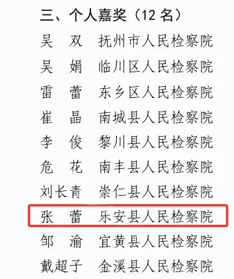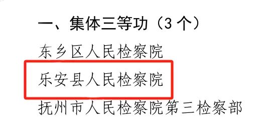 乐安县人民检察院荣获集体三等功,乐安县人民检察院干警张蕾荣获个人嘉奖。