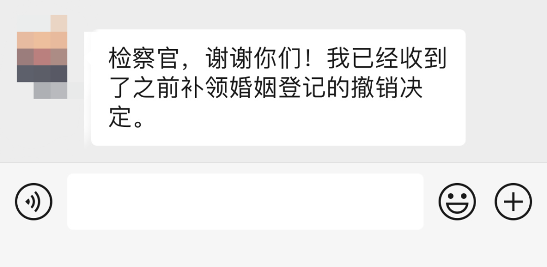 “检察官,谢谢你们!我已经收到了之前补领婚姻登记的撤销决定。”近日,乐安县人民检察院检察官通过微信收到当事人朱某发来的一条感谢短信。